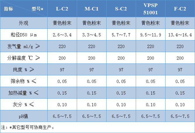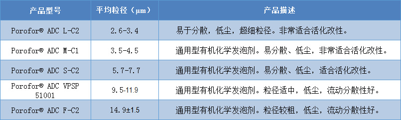 3、规格全。产品粒径覆盖3-15微米,适合于多种发泡应用领域。 精选五种不同粒径的产品,可直接使用,也可进一步改性,扩大ADC发泡剂1.jpg应用范围。其中L-C2和M-C1与活化剂并用后,特别适用于加工温度较低或要求发泡效率较高的场合。